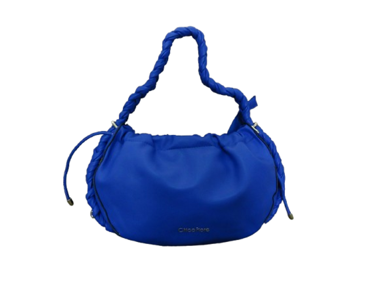 Bolsa AZUL, alça curta trançada e alça transversal, fechamento com zíper e cordão para enrrugar boca, interno toda forrada cetim com zíper.